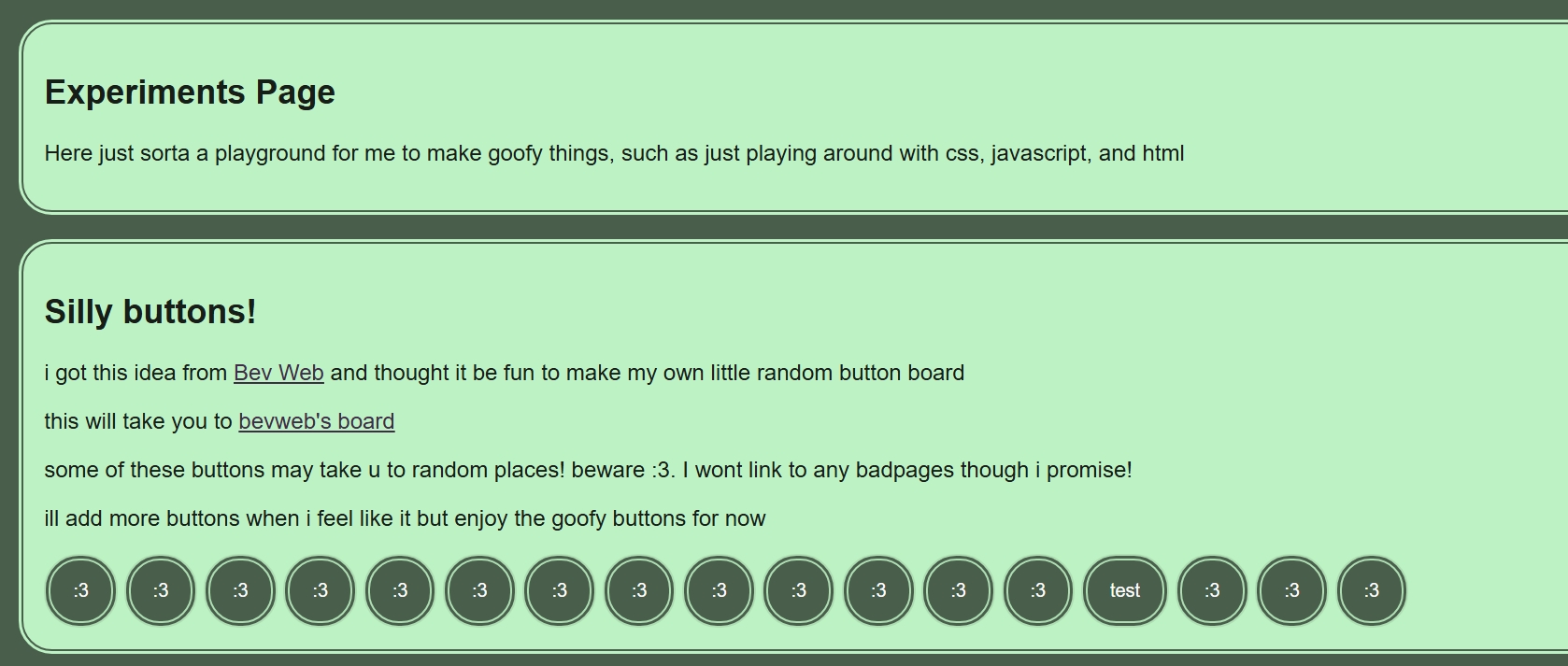 i also created an experimental page to like play around with funky layouts, css, javascript and stuff. Some goofs and all. figure different sections can contain like different things i want to test out.