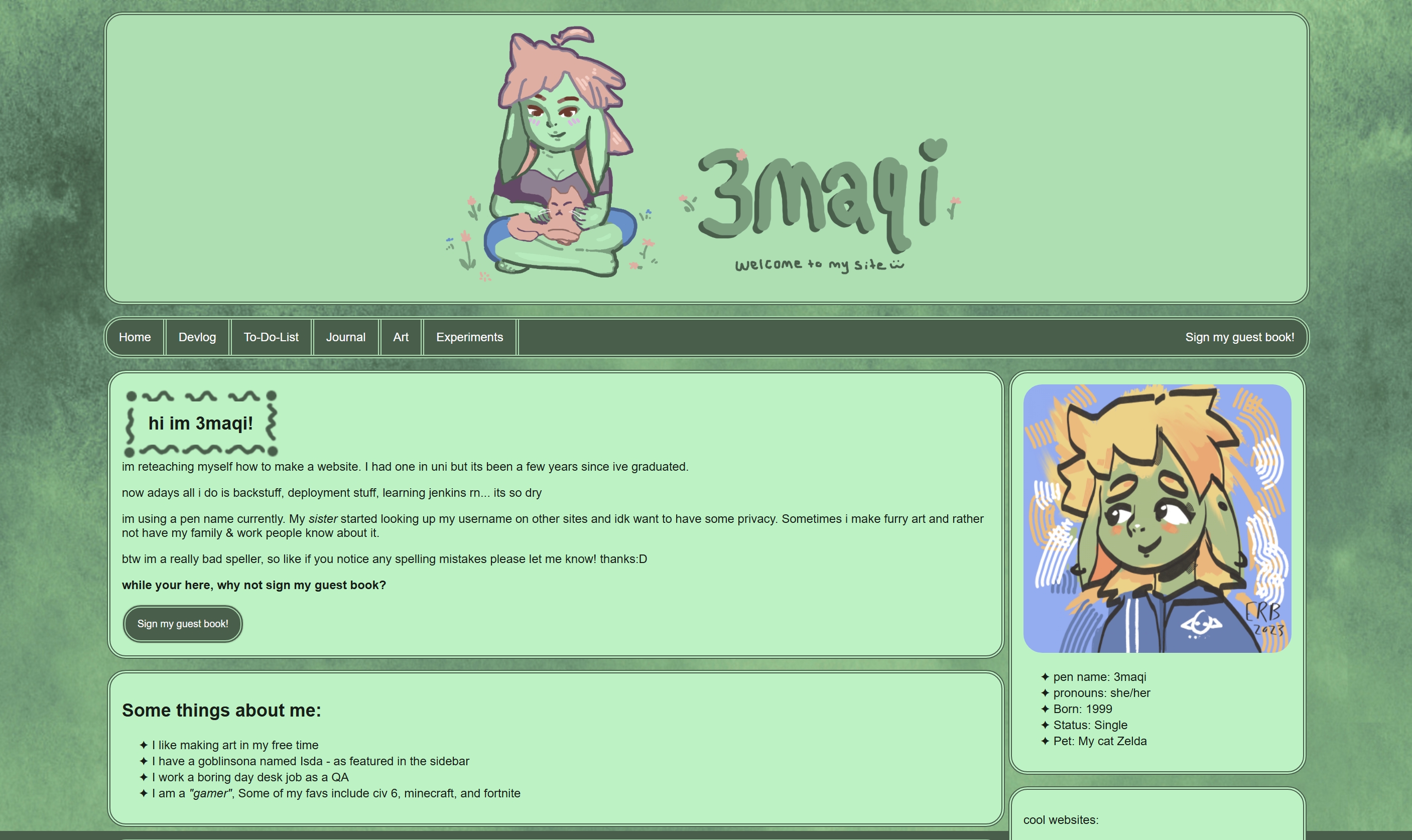 I do want to add a better navigation bar, but rn I just wanna be done and post it online so I can share it with my friends. Oh, also I removed the guest book from the navigation page. I only have like 6 entries, and also i feel like people can also just message me on the neocites profile page i suppose. Or maybe Ill create a google form version?